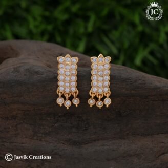 Style: Diamond Look/Real-look Floral Stud Earrings (also known as a ‘Ganga Jamuna’ (GJ) Finish). Design Details: Features a brilliant sunburst or floral cluster design. The entire surface is intricately paved with numerous brilliant-cut white American Diamond (CZ) stones, giving it a high-end, real-diamond appearance. The GJ Finish refers to the dual-tone polish, where the setting…