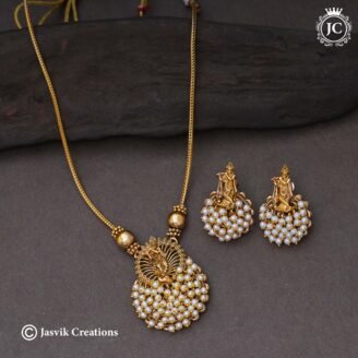 atte Finish Pearl Krishnar Necklace Set Style: A traditional, Matte Gold Finish pendant set featuring the deity Lord Krishna (Krishnar). Set Composition: The set includes a pendant necklace with a chain and a pair of matching stud earrings. Design Details (Pendant & Earrings): The central motif is the image of Lord Krishna playing the flute,…