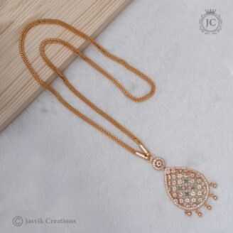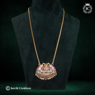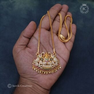 View this post on Instagram A post shared by Jasvik Creations (@jasvik_creation) ## ✨ AD Lakshmi Dollar Chain – JCCH298 (Jasvik Creations) This is a **traditional South Indian-style chain and pendant set** featuring a ‘Dollar’ (pendant) with a depiction of Goddess Lakshmi, adorned with AD (American Diamond) stones. * **Pendant Style:** Features a highly detailed,…