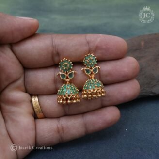 The jewelry set shown in the image by Jasvik Creations is an AD Lakshmi Dollar Chain with matching earrings. Here is a detailed description of the piece, drawing upon the general characteristics of “AD Lakshmi Dollar Chains” and the visible features in the photo: Style: The set features an antique or traditional Indian jewelry style,…