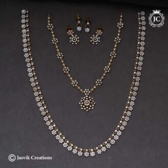 This is a comprehensive and luxurious four-piece combo set featuring brilliant American Diamond (AD) or high-quality cubic zirconia stones, set in a captivating floral cluster design. Set Components: The set includes a long haram (necklace), a shorter necklace (choker/medium length), a delicate matching bracelet, and a pair of coordinating stud earrings. Design: Each piece showcases…