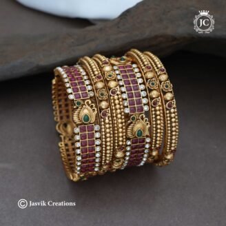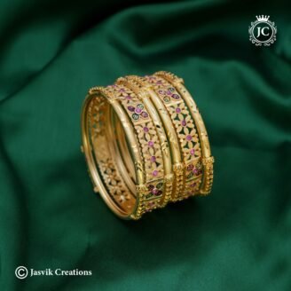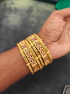 traditional Indian bangles (often worn as a set of four or more) that are typically described as Matte Finish Kemp Bangles or Antique Gold Finish Bangles. Finish: They feature a Matte Gold Plating or Matte Finish, which mimics the look of classic antique gold jewelry while being significantly more budget-friendly than real gold. Stones: The…