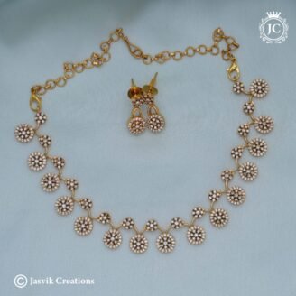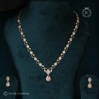 View this post on Instagram A post shared by Jasvik Creations (@jasvik_creation) Premium White AD Cascade Choker Set (Diamond Look): A magnificent choker-style necklace featuring a sparkling cascade of brilliant white American Diamond (AD) stones set in multiple teardrop and diamond-shaped links. The set includes large, matching chandelier earrings. Gold-Toned AD Floral Cluster Necklace Set:…