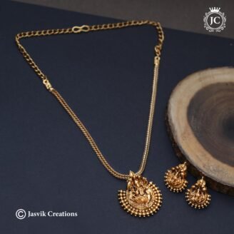 This is a traditional yet versatile South Indian-style short necklace set, perfectly suited for both daily wear and light festive occasions. Pendant: The focal point is a medium-sized, semi-circular Lakshmi pendant featuring the seated Goddess Lakshmi figure in an intricate, detailed relief. The outer edge is bordered with small, suspended gold beads (Ghunghroos or pearl…
