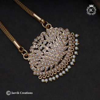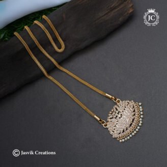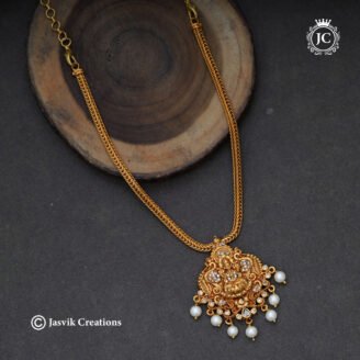 This is an elegant long chain featuring a prominent, decorative pendant, often referred to as a “Dollar” or Muhurtam Chain style. Item: A long necklace with a central pendant/locket. Chain Type: The chain itself is a fine, gold-polished, serpentine or foxtail weave, suitable for traditional Indian wear. Pendant (Dollar): The pendant is a large, ornate…