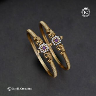 This is a statement-making kada bangle featuring a rich antique gold finish that replicates the heirloom quality of traditional Indian jewelry. It showcases intricate Nakshi or temple-style craftsmanship, often incorporating traditional motifs like majestic elephants (symbolizing strength and grace) or the Goddess Lakshmi. The broad, ornate design is frequently adorned with Kemp (red and green)…