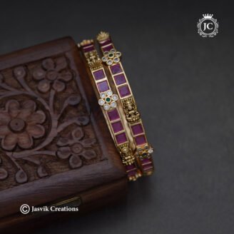 These are exquisite premium bangles featuring a traditional South Indian Temple Jewelry design. They are crafted with an antique gold finish and prominently studded with vibrant, square-cut Kemp stones (ruby/magenta and emerald/green accents). The highlight is the central Lakshmi motif carved elegantly on the bangle, symbolizing wealth and prosperity. The square-stone setting and clustered floral…