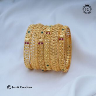 This is a set of four gold-polished bangles featuring intricate traditional patterns. They are adorned with small, colorful ruby (pink/red) and emerald (green) colored stones/kemp stones, offering a rich, classic look. Style: Traditional/Ethnic/Temple Jewellery Look. Key Features: Matte gold finish, detailed engraving/filigree work, and colored stone accents (ruby and emerald simulants). Occasion: Perfect for festive…