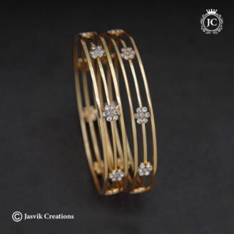 This is a set of four slim bangles with a delicate, contemporary design, emphasizing minimalism and subtle sparkle. Style: Minimalist, Contemporary, and Stackable. Key Features: Micro Plating: Provides a bright, fine, and durable gold finish. Design: Each of the four bangles is simple and slender, featuring small, clustered flower motifs placed symmetrically around the circumference….