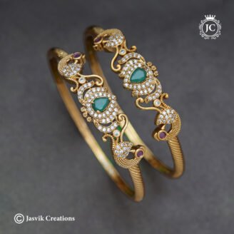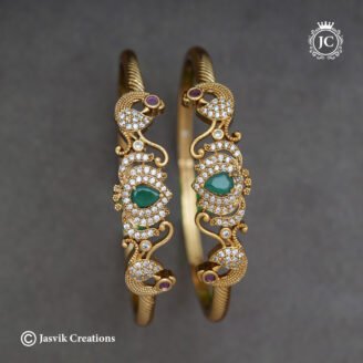 This is a pair of two premium kada bangles, characterized by an ornate, traditional, and heavy look, likely featuring an antique gold finish. Style: Traditional Temple/Antique Jewellery Kada. Key Features: Motifs: Features prominent peacock heads at the clasp/opening ends and a stylized lotus or floral element at the center. The combination of these motifs is…