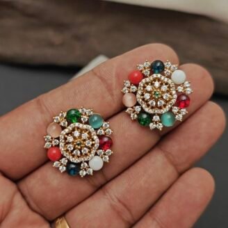 This is an ornate pair of traditional Indian stud earrings featuring a classic Navarathna (Nine Gems) design. Design: These are large, circular stud earrings with a central, raised gold motif surrounded by a ring of stones. The center features an intricate gold pattern, likely accented with small clear stones (American Diamonds or AD). The outer…