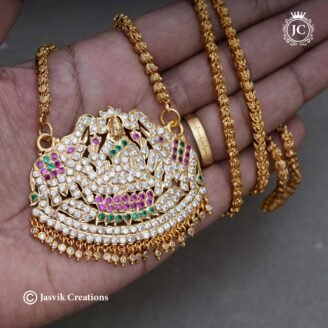 This is a visually stunning, long statement necklace featuring a large pendant (Dollar) of the Gaja Lakshmi motif completely paved with brilliant stones. Pendant Motif: The large pendant depicts Gaja Lakshmi (Goddess Lakshmi flanked by elephants), which is rendered almost entirely in an elaborate, pave-style setting of stones. Stones: The surface is dominated by clear,…