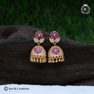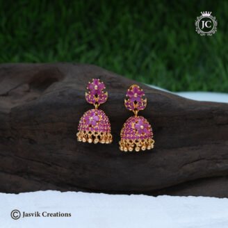 This is an exquisite pair of traditional Indian Jhumka earrings with a rich, ruby-red (or deep pink) color focus. Design: These are bell-shaped (jhumka) earrings with intricate American Diamond (AD) stone work. The stud features a central flower motif brilliantly set with the primary ruby/red-colored stones, accented by clear AD stones. The bell (jhumka) component…