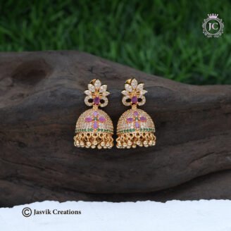 This is an elegant pair of traditional Indian bell-shaped Jhumka earrings featuring a colorful and intricate American Diamond (AD) stone setting on a microplated gold base. Design: The earring is a classic Jhumka style with a detailed stud component and a dangling bell. The stud features a central floral motif set with deep pink/ruby AD…