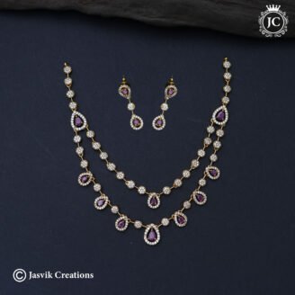 Necklace Design: The necklace consists of two independent, yet connected, lines of stones, creating a layered, cascading effect. The upper line is primarily composed of small, linked circular settings, each holding a clear white stone (likely American Diamonds or AD). The lower line alternates between the white stone clusters and larger, pear-shaped (teardrop) deep green…