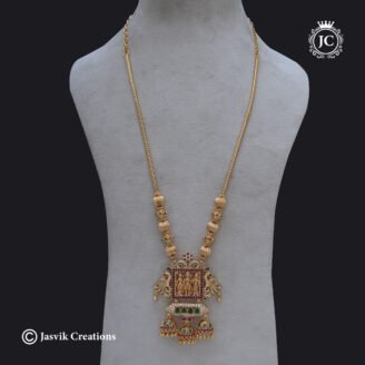 This is an elegant and traditional piece of South Indian jewelry, often referred to as a “Manga Malai” or “Temple Jewelry” style due to its antique finish and deity motifs. Design & Finish: The chain and pendant feature a rich antique finish, giving the gold tone a matte or oxidized look that mimics traditional heirloom…