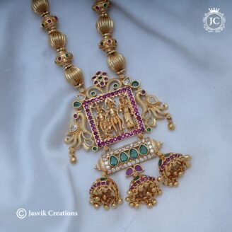 This is an exquisite Micro Gold Plated Ram Parivar Haram (Long Necklace), a piece of traditional Indian temple jewelry. Design: The necklace features a prominent rectangular pendant (locket) centrally depicting the divine trio of Lord Rama, Goddess Sita, and Lord Lakshmana (the Ram Parivar). Embellishment: The pendant is richly adorned with multi-colored Kemp stones (ruby…