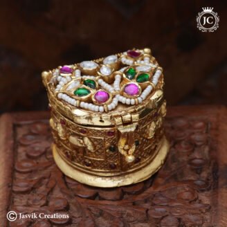 his is a beautiful, traditionally inspired container designed to hold kumkum (vermilion) or other auspicious powders, often used in Hindu rituals or for storage on a dressing table. Base Material: The box is constructed using a Brass Base, a durable and classic material that gives it a solid, weighty feel [Image: 23 Brass Base Kum…