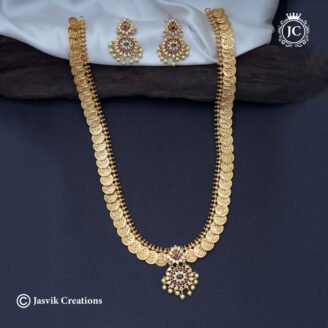 This is a magnificent piece of traditional South Indian jewelry, known as a Coin Haram (Kasu Malai), which is typically a long necklace or chain. Length and Style: It is a Haram, indicating a longer length, designed to be worn below the collarbone, often reaching the chest or below [Image: 514 Premium Coin HAram Chain…