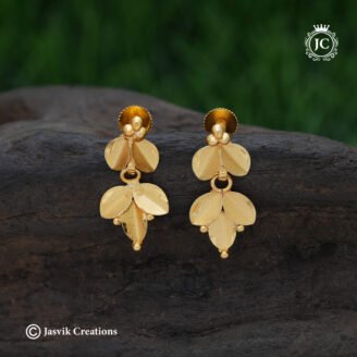 This is a pair of traditional Indian gold drop earrings (often referred to as ‘Forming Ear-Rings’ in jewelry cataloging). They feature an intricate, layered floral or leaf design with a matte, textured finish. Design: Each earring consists of a small, domed stud base (with tiny beaded accents) from which two larger, stylized petal or leaf…