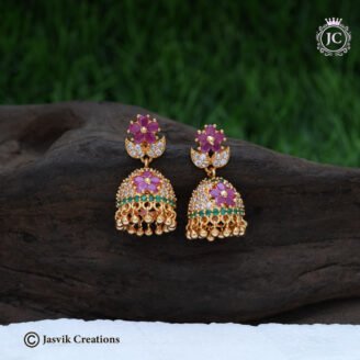 This is a pair of traditional Indian Jhumka earrings with a contemporary, colorful design. Design: These are bell-shaped (jhumka) earrings with a detailed stud component. The stud features a central flower motif set with deep pink/ruby-colored stones (likely American Diamonds or AD) and is accented with clear AD stones around the edge. The bell (jhumka)…