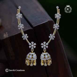 This is a contemporary and elaborate piece of jewelry combining a modern ear cuff with a traditional jhumka. Style: It is a single long earring designed to follow the curve of the ear, classified as an Ear Cuff Jhumka. Finish: Features a GJ Polish (a common term for high-quality gold polish on imitation jewelry) and…