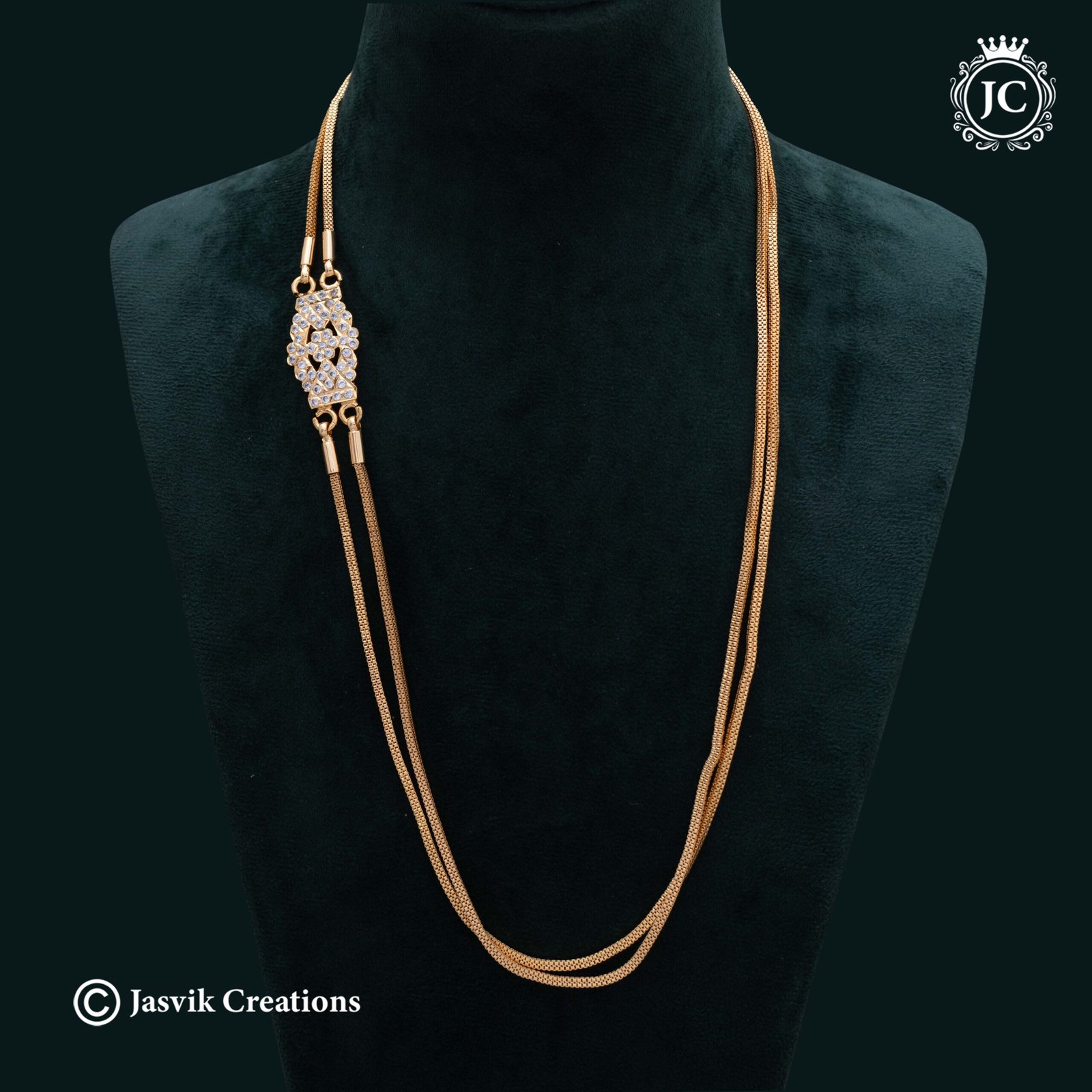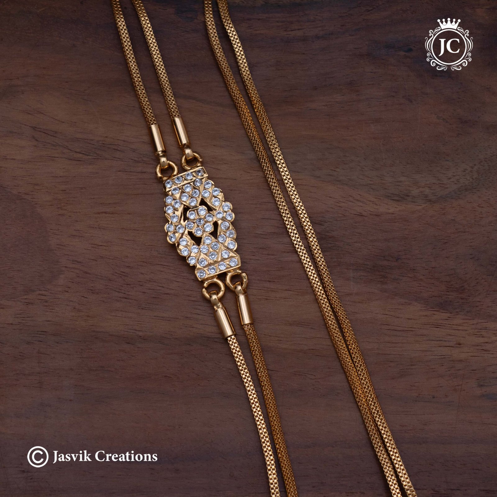 The overall design is a perfect blend of traditional and contemporary. The functional two-line chain is a classic style, while the modern, diamond-studded mugappu adds a touch of sophistication and sparkle. This chain is versatile enough for both daily wear and special occasions.