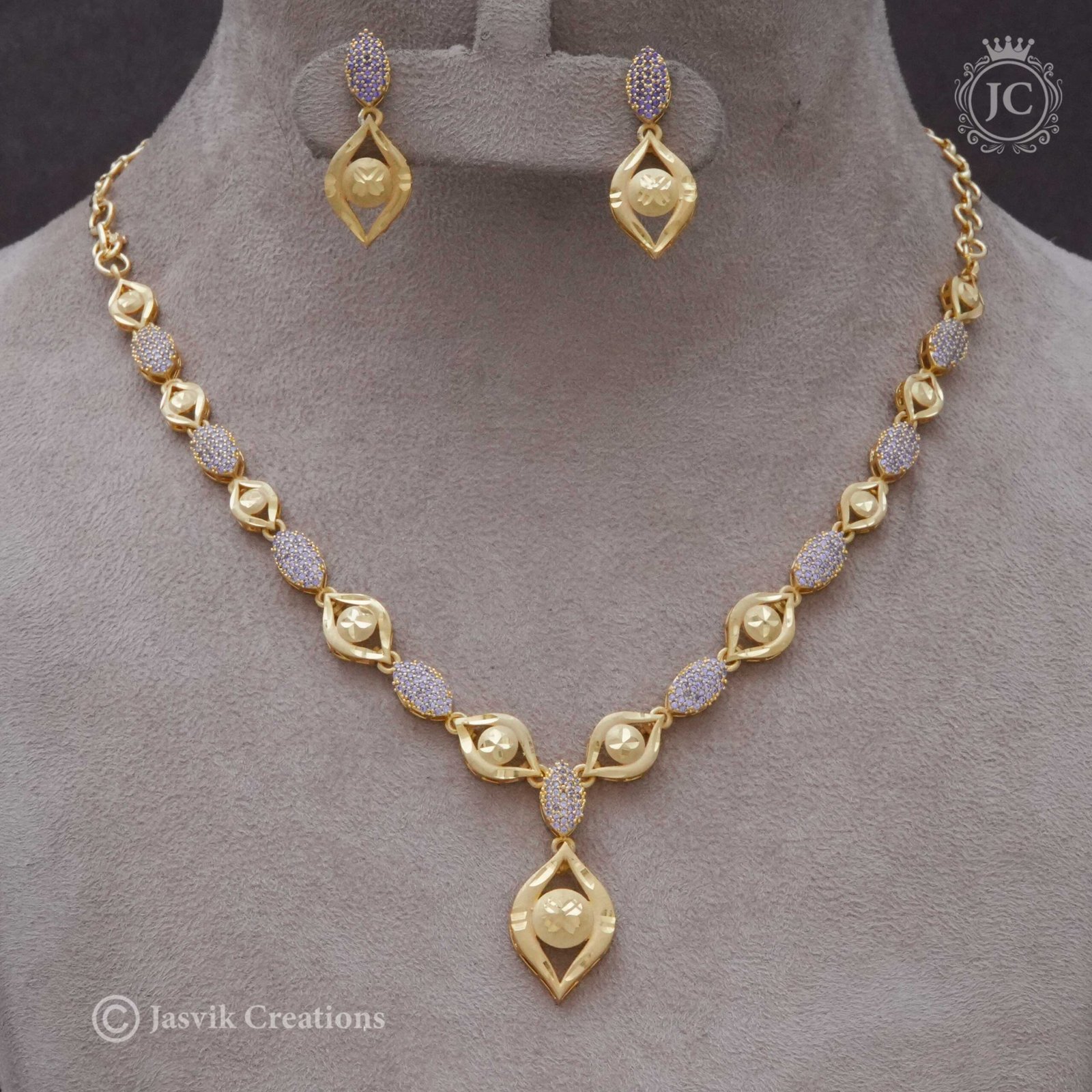 A contemporary gold-toned necklace featuring a sequence of interconnected, elongated marquise or leaf-shaped links. These links alternate between highly polished gold-toned metal and links completely studded with brilliant Blue American Diamond (AD) stones. The necklace drops into a single, slightly larger AD-studded link from which a polished gold-toned marquise pendant with a central ball/stone detail is suspended. The set includes matching earrings that echo the central pendant’s design. This piece offers a modern, yet elegant look.