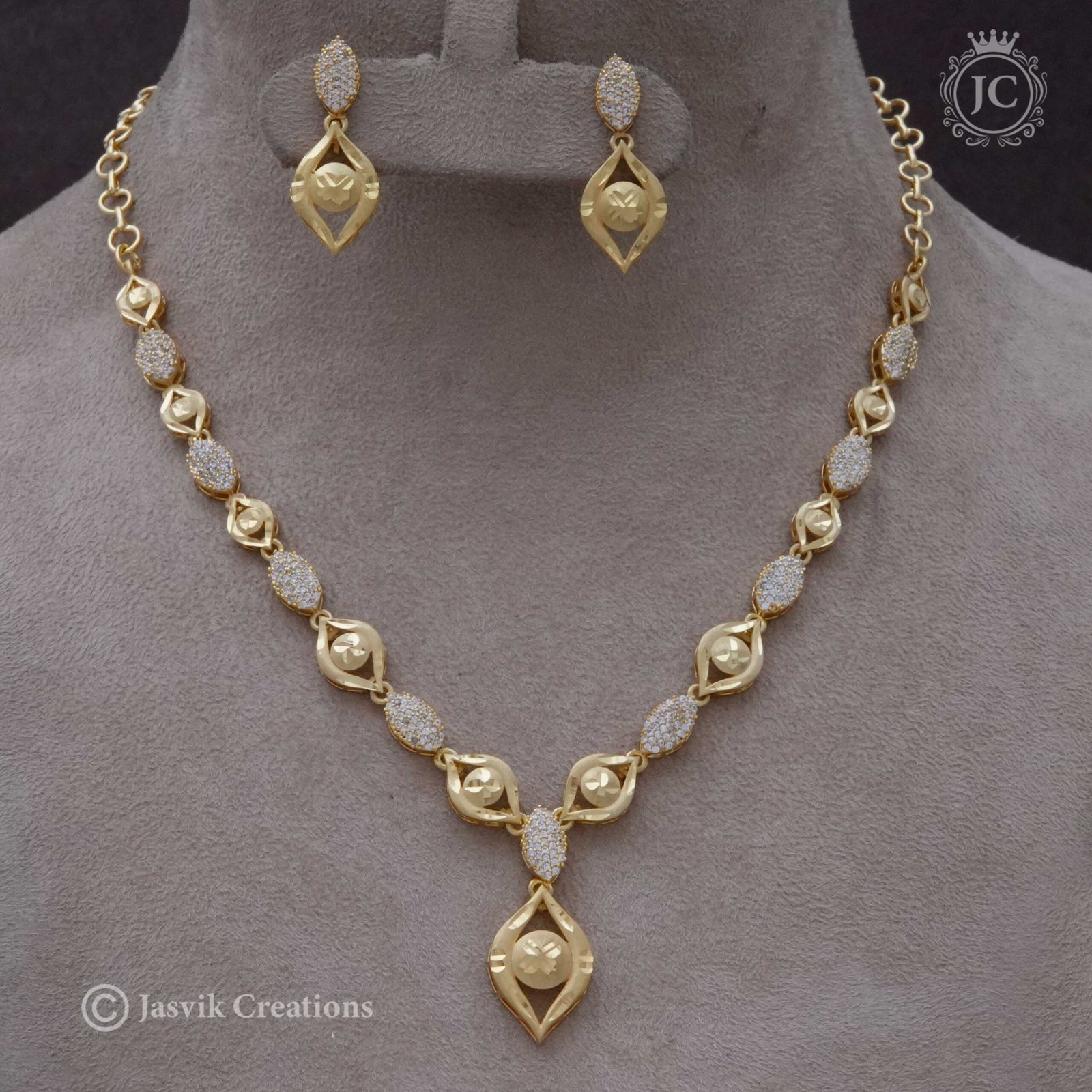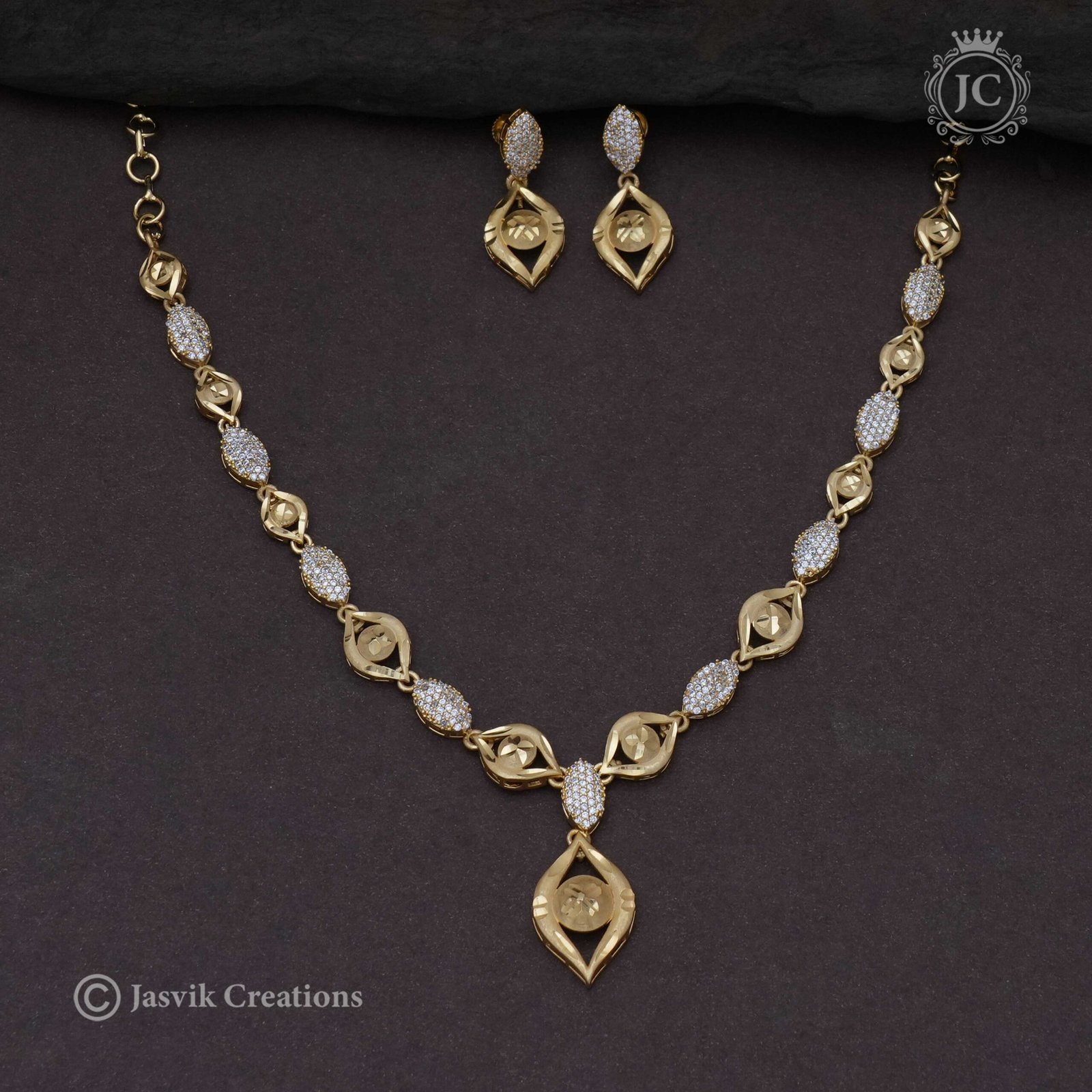 A contemporary gold-toned necklace featuring a sequence of interconnected, elongated marquise or leaf-shaped links. These links alternate between highly polished gold-toned metal and links completely studded with brilliant white American Diamond (AD) stones. The necklace drops into a single, slightly larger AD-studded link from which a polished gold-toned marquise pendant with a central ball/stone detail is suspended. The set includes matching earrings that echo the central pendant’s design. This piece offers a modern, yet elegant look.