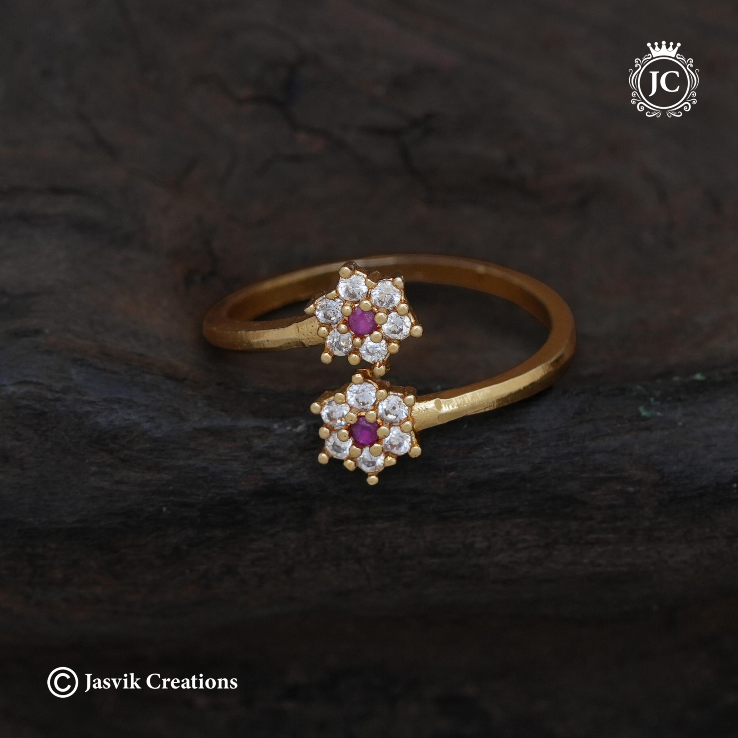 Design: A stylish bypass-style ring showcasing two delicate flower clusters that meet at the center.