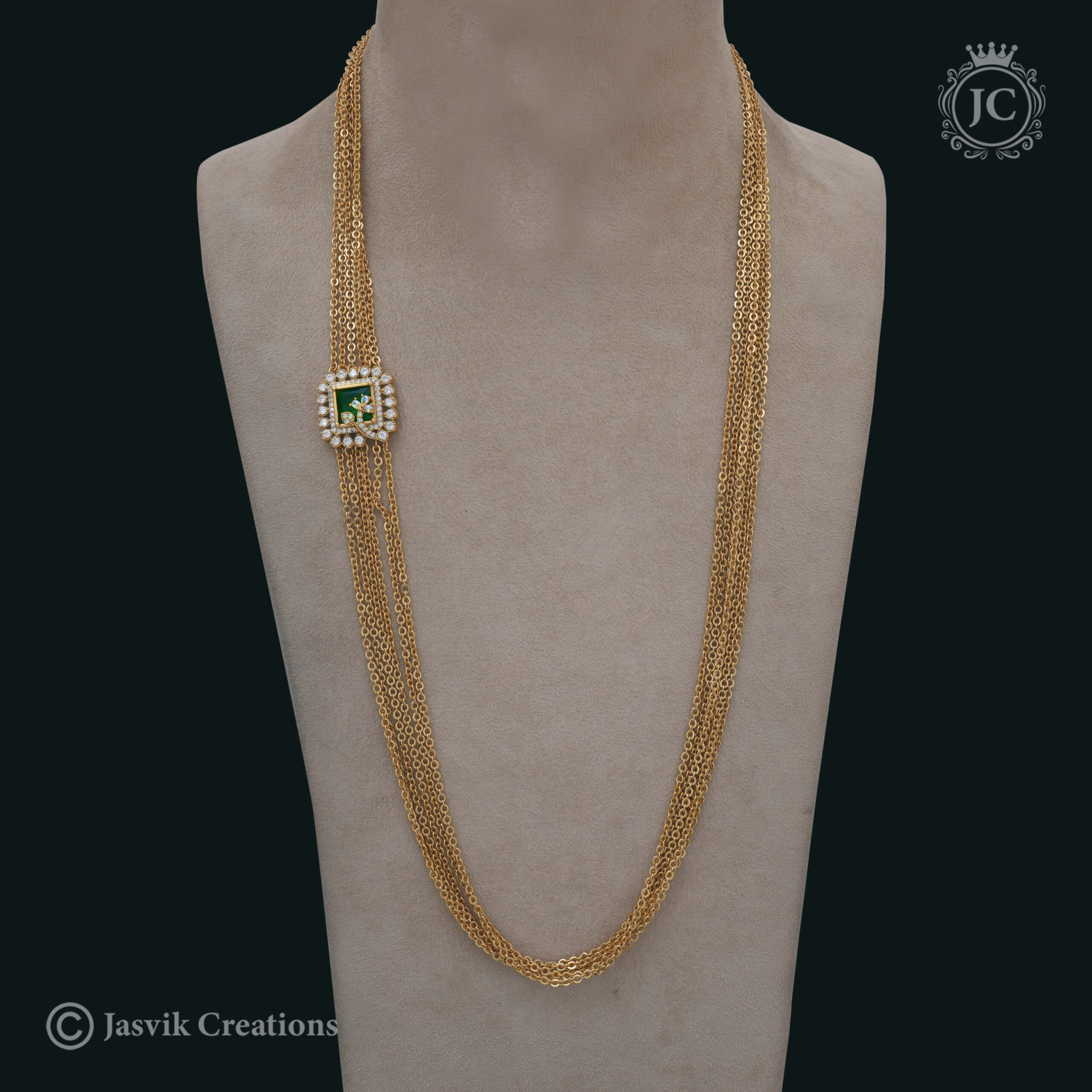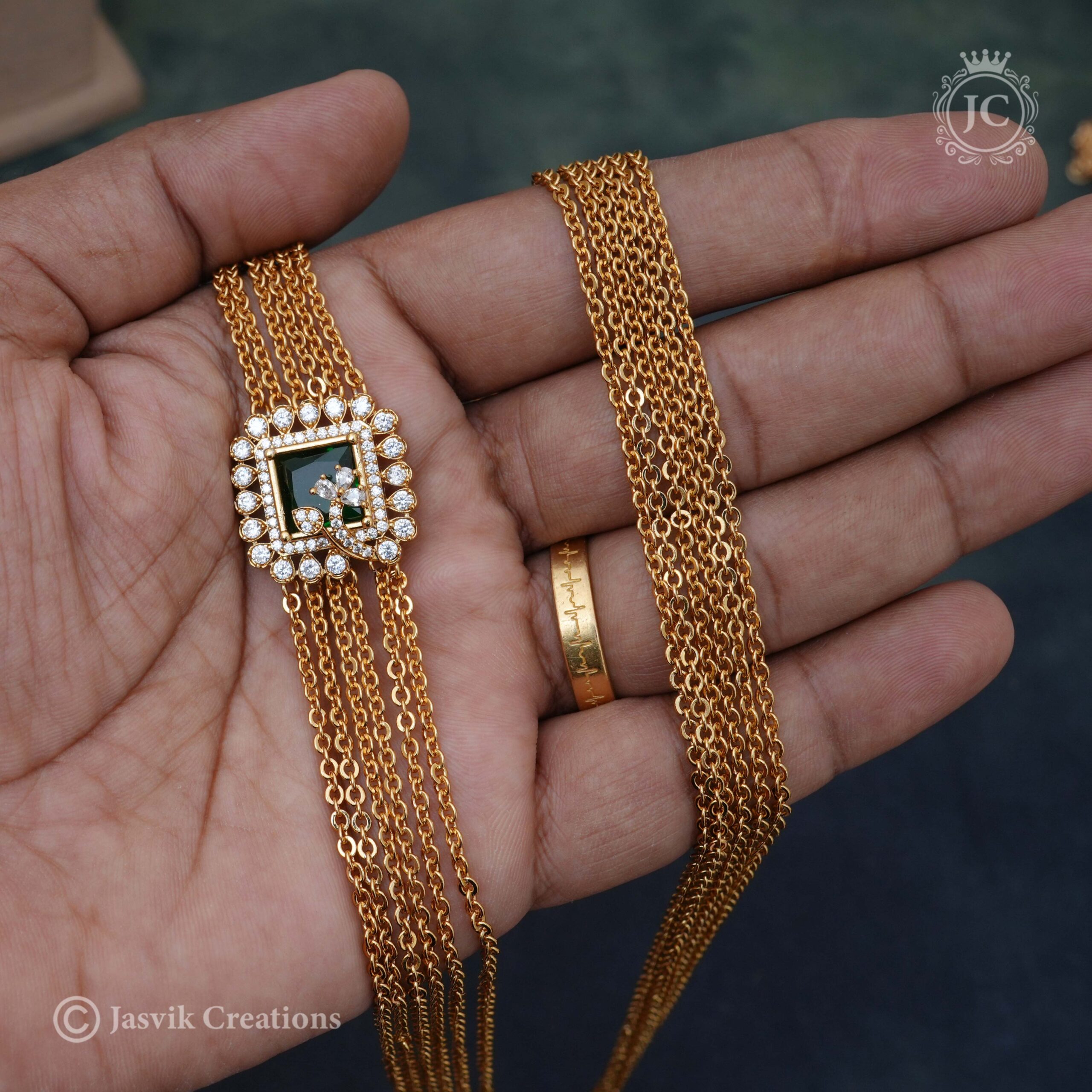 Design: The haram features a long, flowing chain, which is often composed of interconnected, intricately designed links. The name “Chandra” might be reflected in the design through circular or crescent-shaped elements. A large, ornate pendant serves as the centerpiece. The design is meticulously detailed and often includes traditional patterns, such as delicate filigree work or embossed motifs.