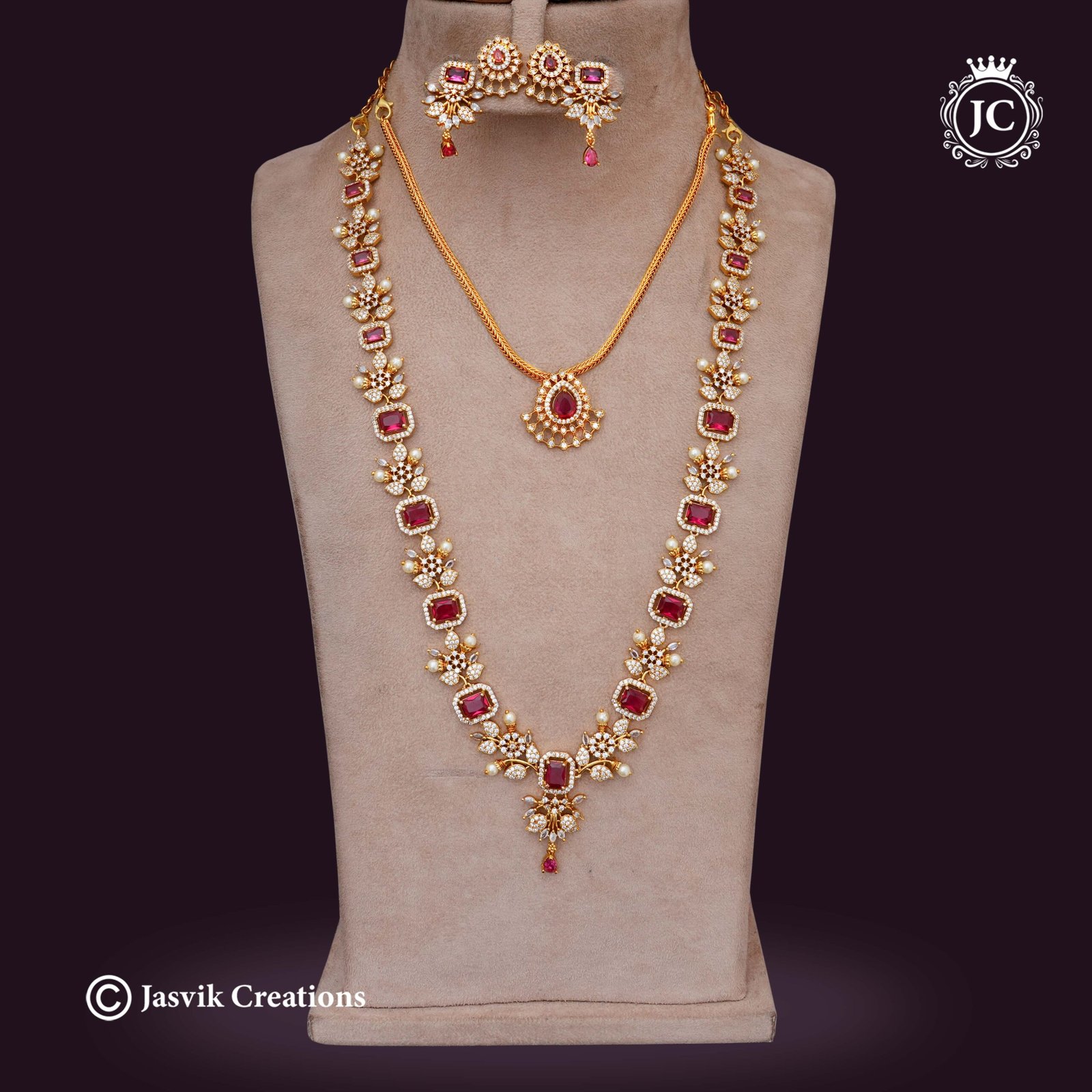 Design: The set includes a long haram necklace, short necklace, and matching earrings, all crafted with intricate floral and temple-inspired motifs.