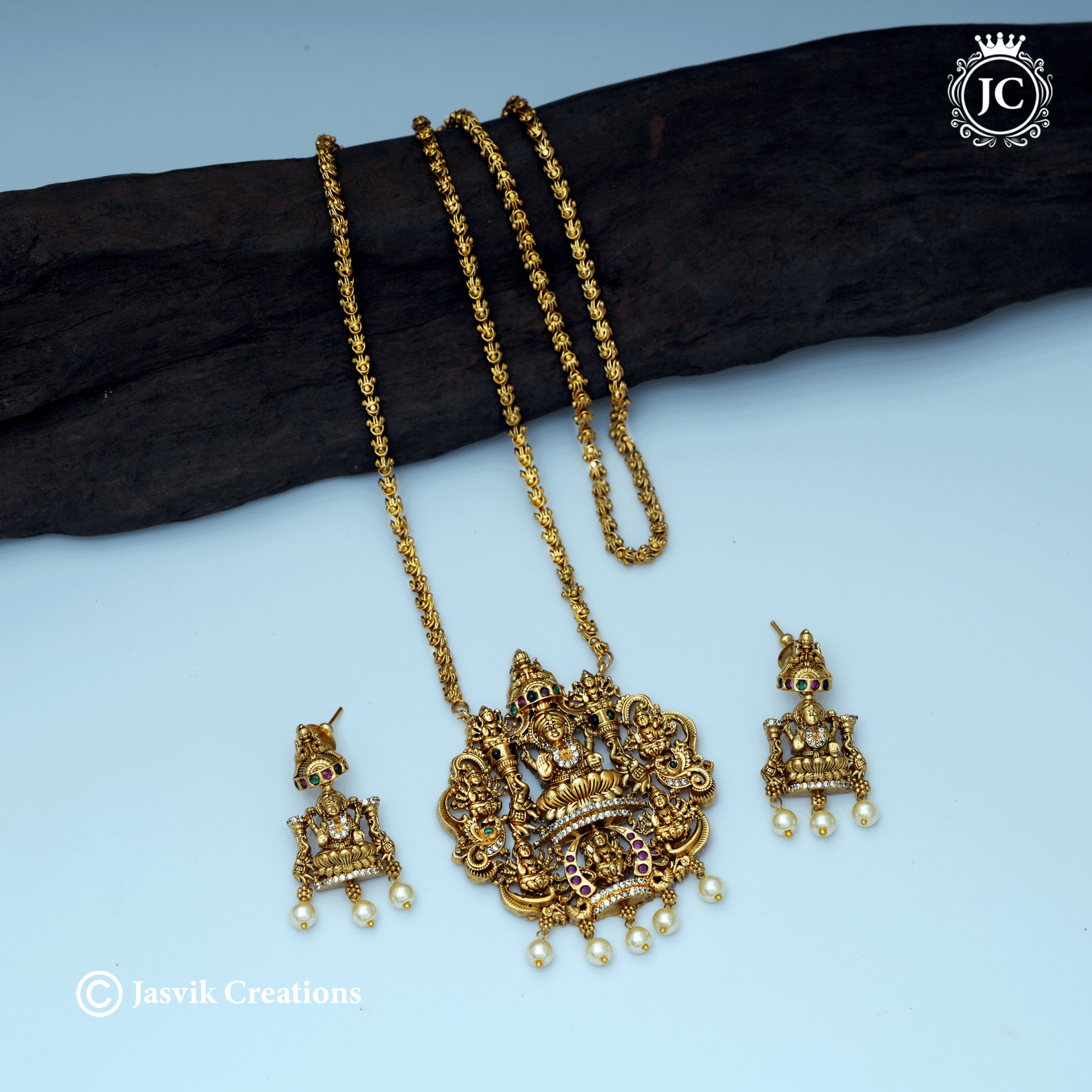 The central Ganesha motif is intricately detailed and set within a decorative frame embellished with red and green kemp stones and sparkling white cubic zirconia (AD stones). The pendant is suspended from a gold-tone chain (likely a simple, long chain) and is paired with matching drop earrings that echo the central color scheme. This set is a classic piece of Temple-inspired jewelry, revered for its spiritual significance and traditional artistry.