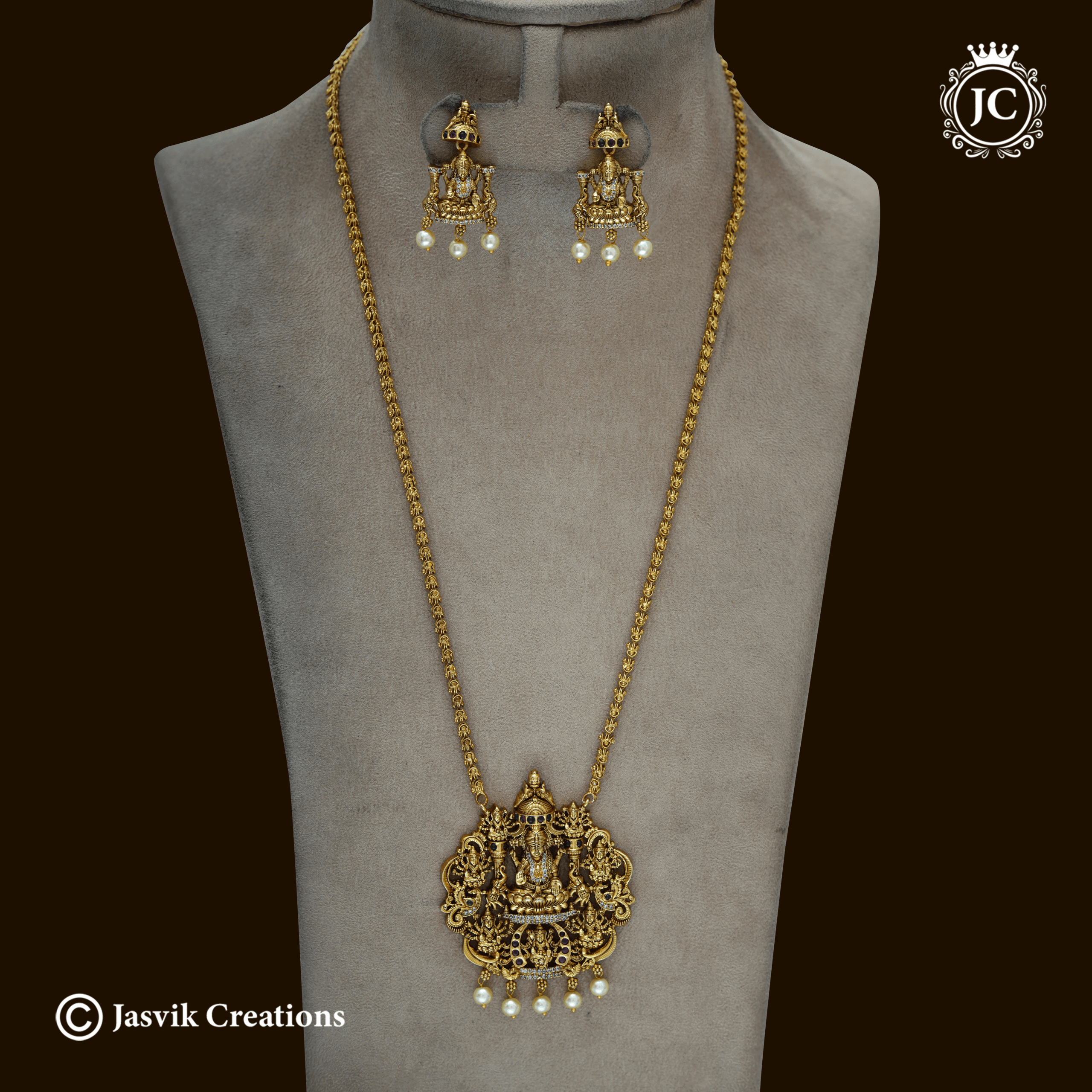 An elegant antique gold-tone pendant necklace featuring a significant, coin-style pendant (or Dollar) in the shape of Lord Ganesha (the elephant-headed Hindu deity).