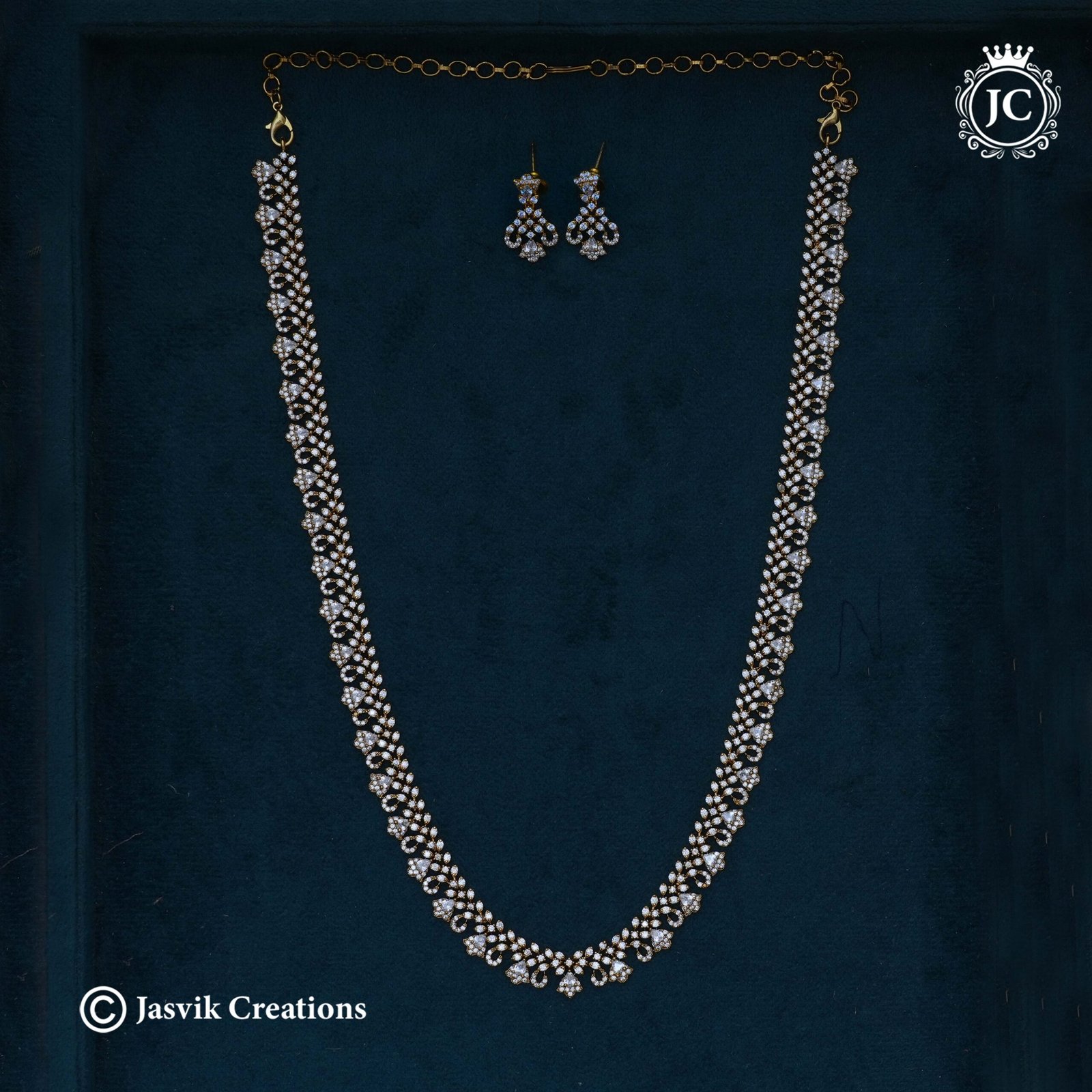 An exquisite long necklace (Haram) featuring an antique or black rhodium finish setting, densely studded with brilliant AD (American Diamond) stones. The design showcases a repeating, scalloped floral motif, giving it the appearance of traditional closed-setting diamond jewelry. The set is completed with small, matching floral stud earrings, making it a luxurious statement piece for weddings and grand occasions.