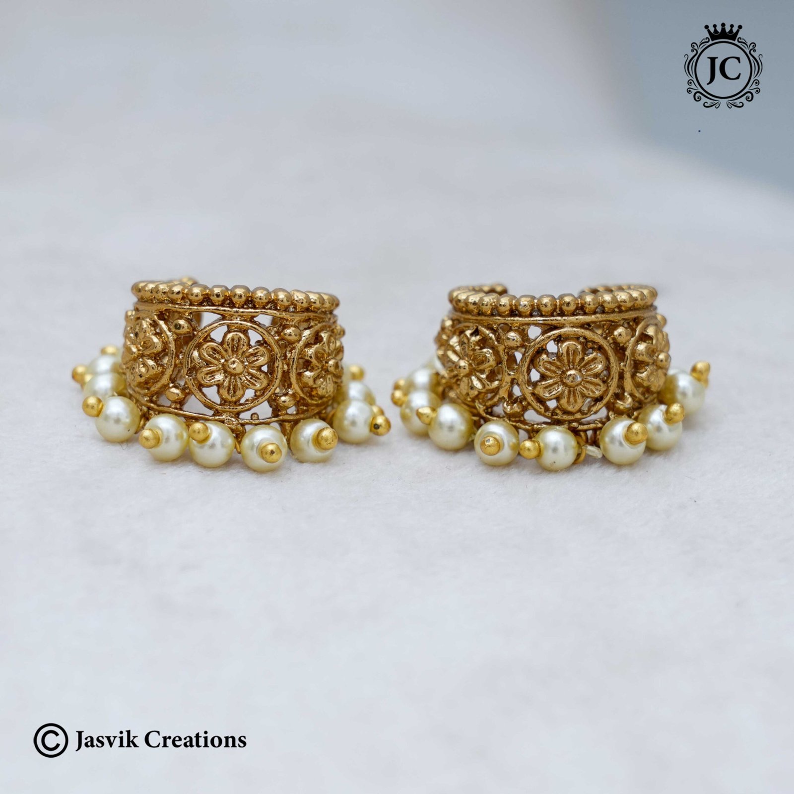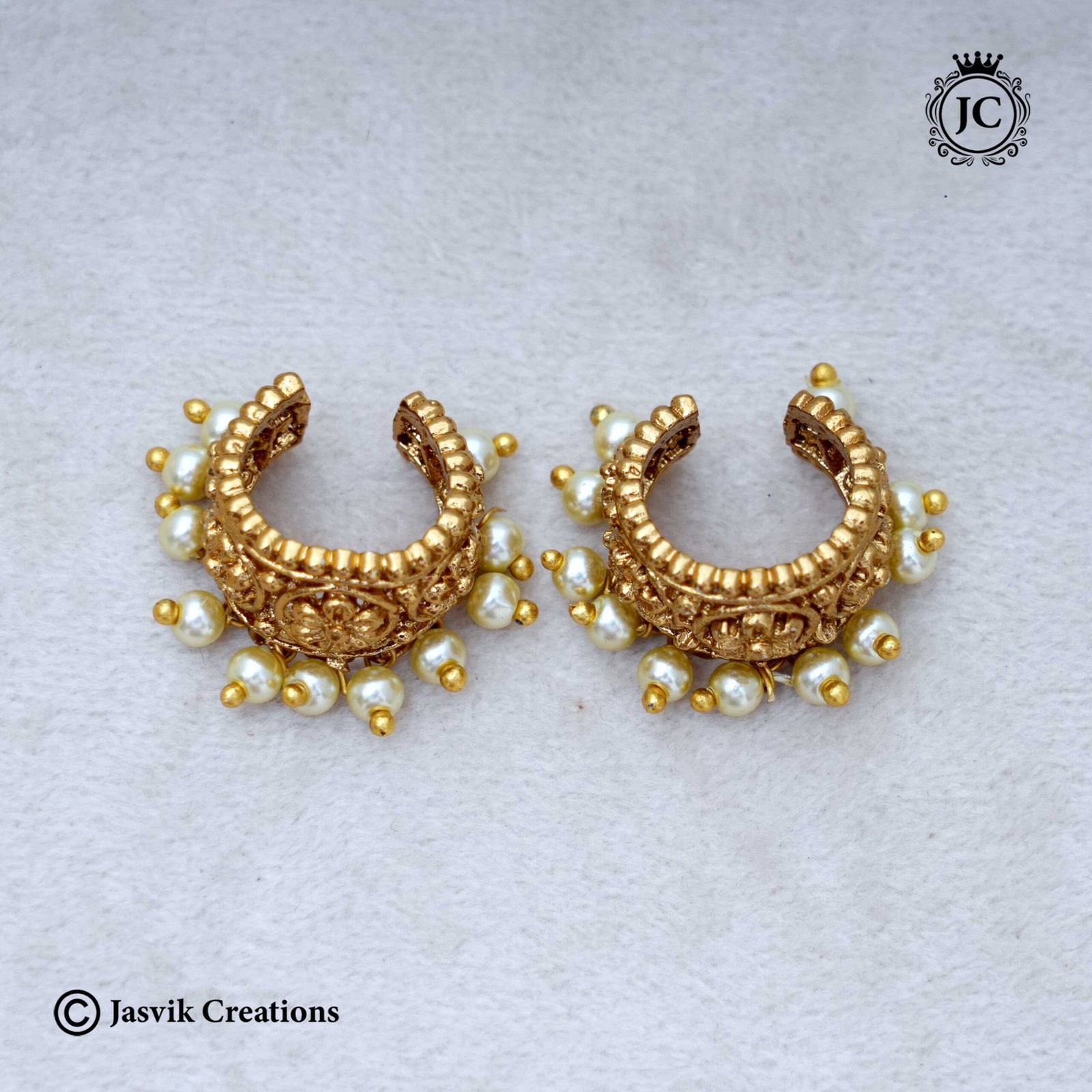 Embrace classic South Indian ear jewelry with these gorgeous Antique Finish Bugudi Studs. Featuring intricate floral engravings and delicate pearl drops, these traditional ear ornaments are designed to securely hug the earlobe or helix (often without a piercing). The matte antique gold look adds a touch of ethnic grandeur, perfect for pairing with sarees and festive attire.