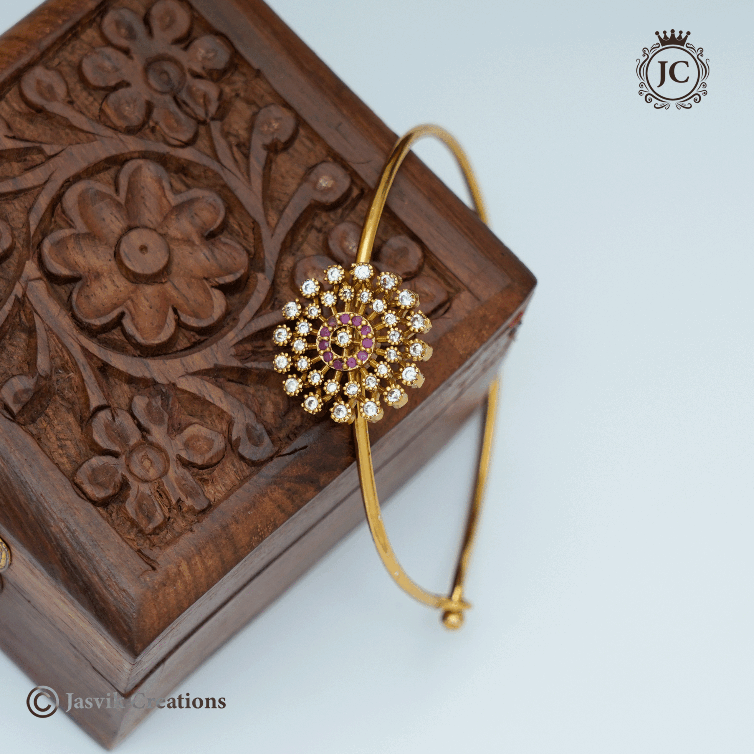 Overall Look: This is a short, elegant bracelet designed to be worn as a single statement piece, combining the traditional look of a kada with the brilliance of stone-studded jewelry.