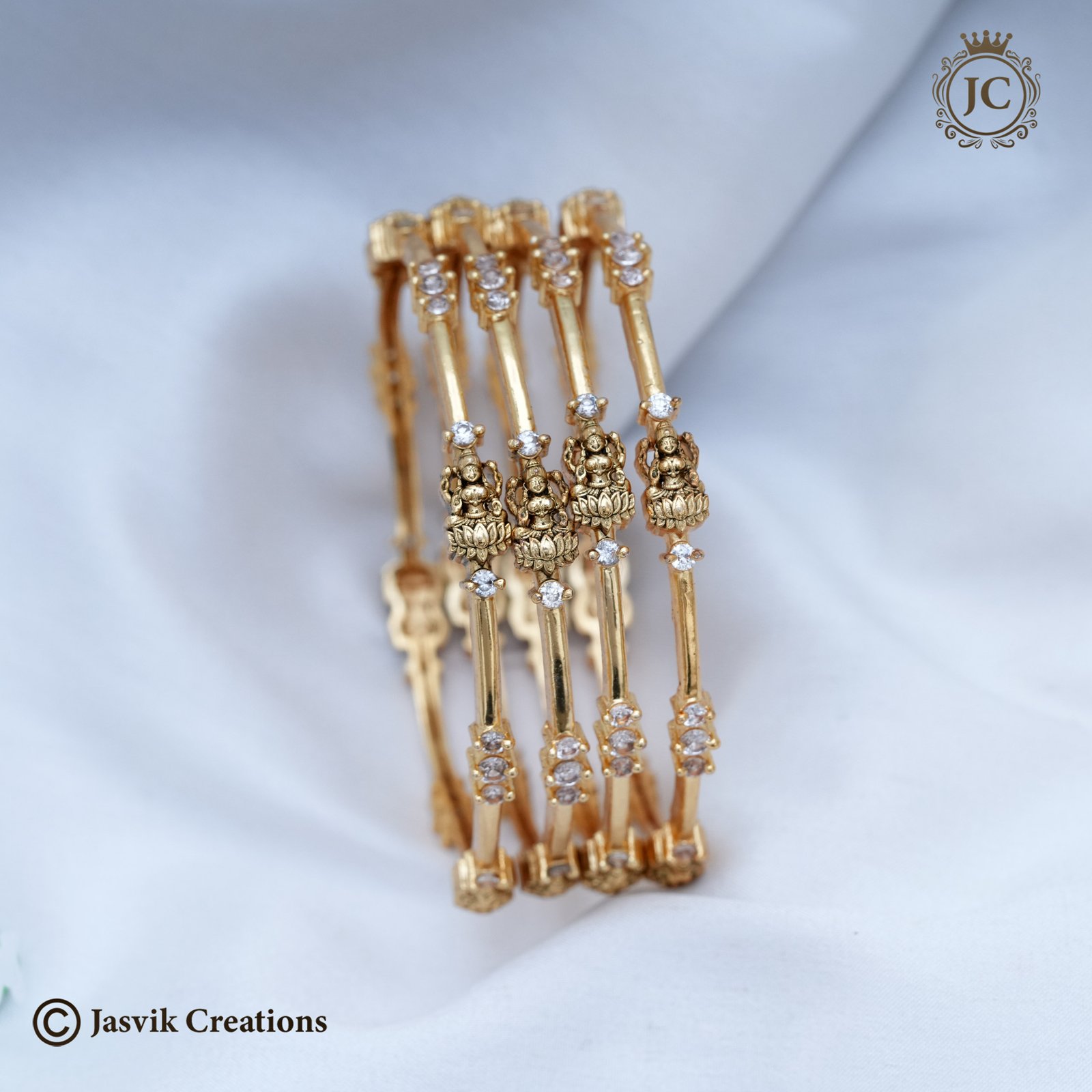 Design: Each individual bangle is slender and features a repeating arrangement of intricate, miniature Goddess Lakshmi motifs placed vertically along the band.