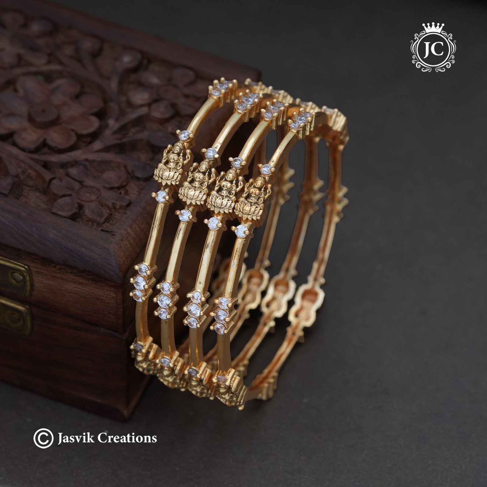 Finish: The bangles possess a matte or antique gold finish, which is characteristic of traditional South Indian temple jewelry. This finish enhances the detailed sculptural work of the Lakshmi idols.