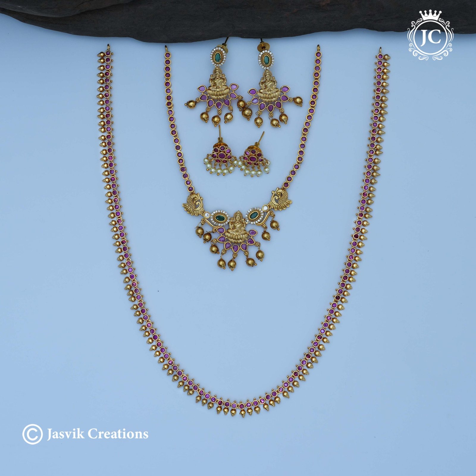Material & Craftsmanship Generally made from a metal alloy (like copper or brass) and finished with high-quality gold plating, often marketed as “one-gram gold” or imitation jewelry. The craftsmanship is intricate, focusing on minute details to mimic genuine heirloom temple jewelry.