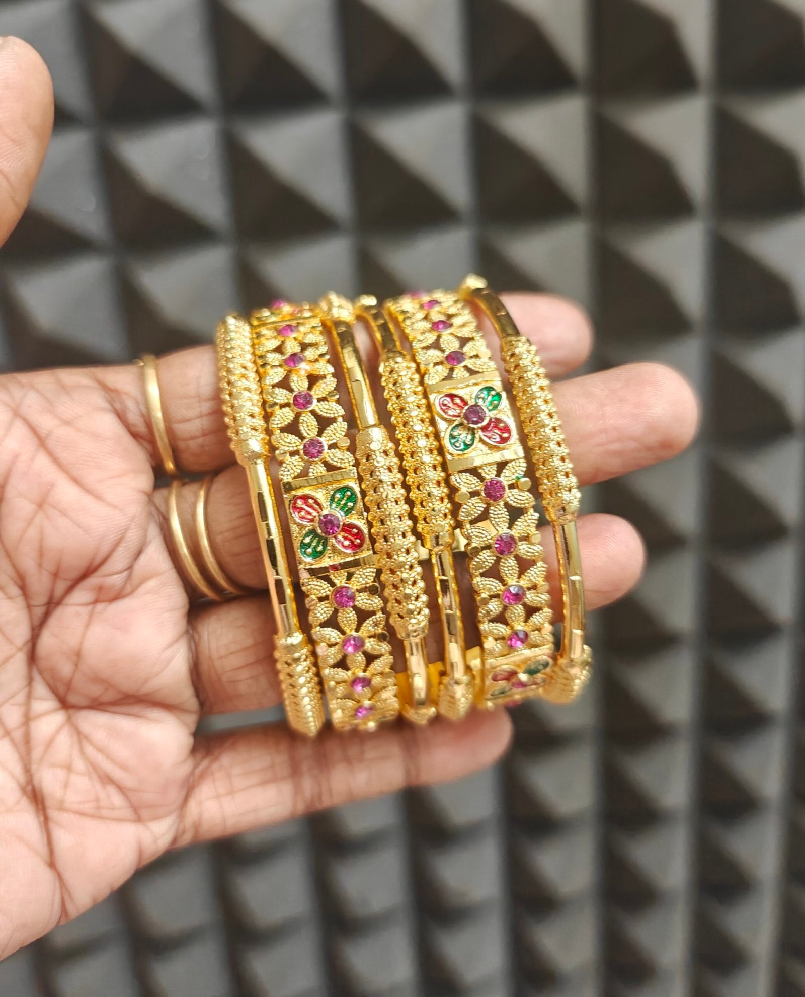 Design: A combination of wide floral-patterned “Kada” style bangles and sleek, textured spacer bangles.