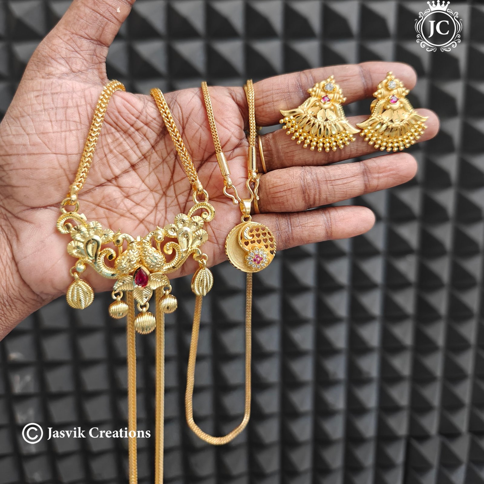 A beautiful and affordable traditional jewelry set featuring a long gold-tone chain with a delicate, ornate pendant. The set is completed with a pair of matching, intricate stud earrings with a jhumka-style bottom design and colored stone accents (likely ruby or pink). This imitation jewelry offers a classic, traditional look, perfect for everyday wear or festive occasions.