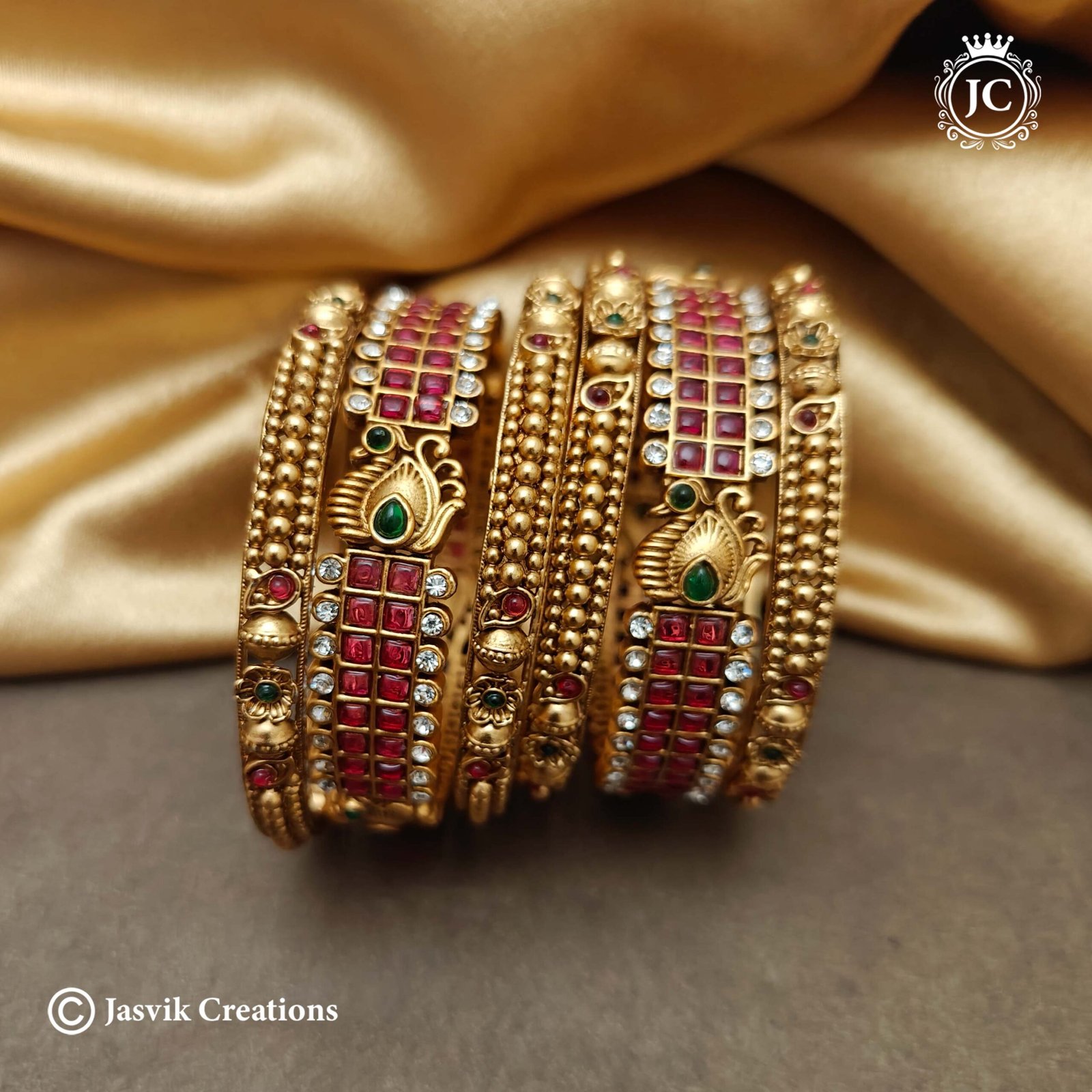 traditional Indian bangles (often worn as a set of four or more) that are typically described as Matte Finish Kemp Bangles or Antique Gold Finish Bangles.