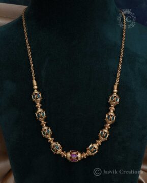 This Budget-Friendly Premium Lakshmi Necklace Set by Jasvik Creations (JCNL781) offers a sophisticated take on traditional temple jewelry, balancing spiritual motifs with a modern, sleek chain design.