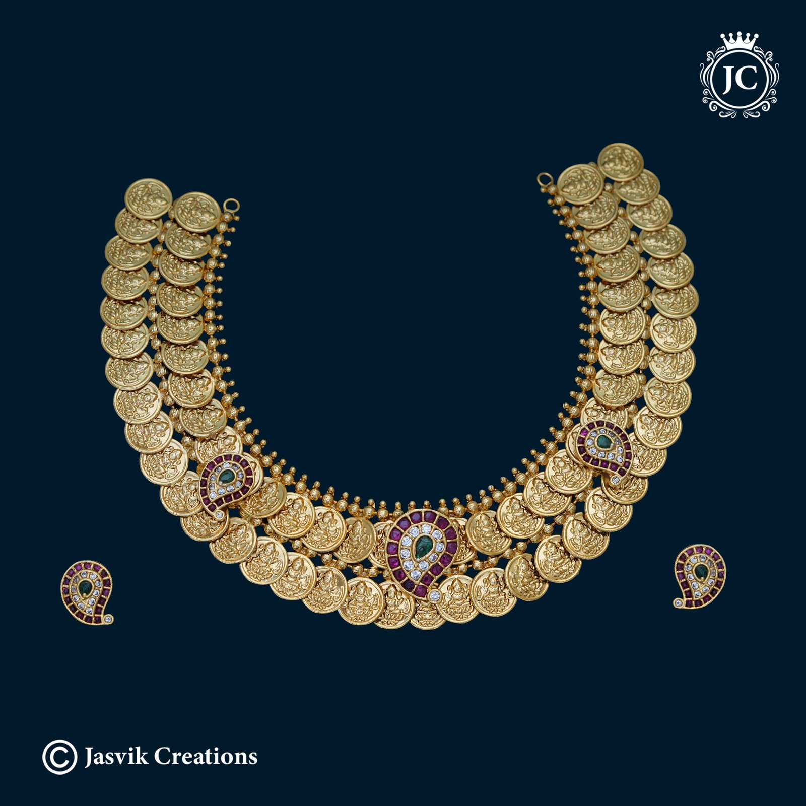 Design: The necklace is composed of two closely layered rows of small, circular coins (reminiscent of the South Indian Kasu Malai style). The coins are embossed with a traditional motif, likely of Goddess Lakshmi, symbolizing prosperity.