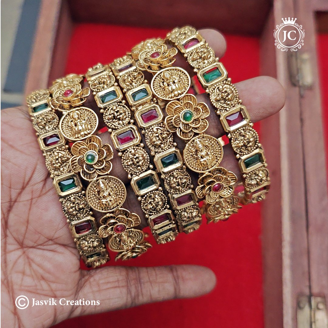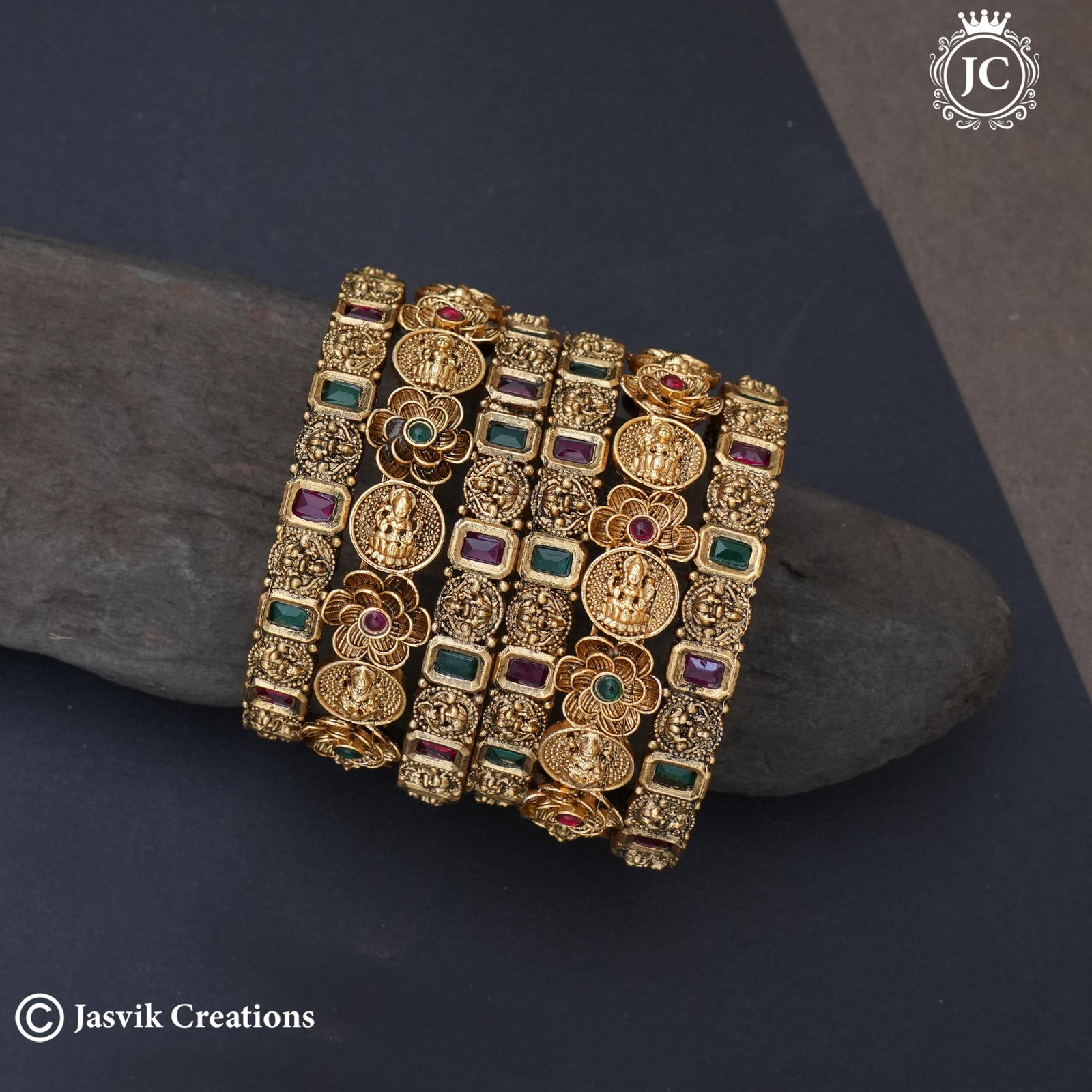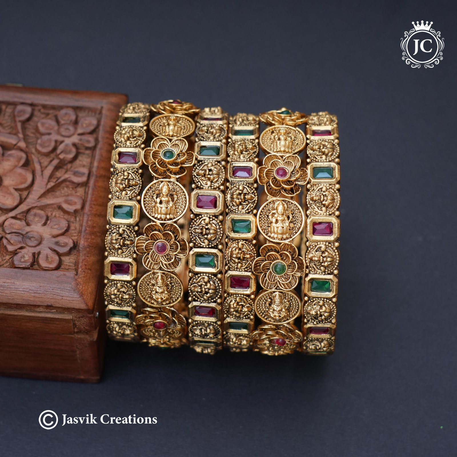 This is a set of six (6) antique gold-finish bangles featuring a richly traditional South Indian temple jewelry design. The set is characterized by: