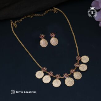 Sasitrends Lakshmi Coin Necklace Set: This micro gold-plated set features a large central Lakshmi coin surrounded by smaller ones, offering a rich, temple-jewelry look with matching earrings.