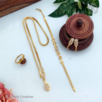 Long Muggappu Chain: A long, box-style gold chain featuring a side-set “Muggappu” (ornamental side piece) made of four connected crystal flowers.