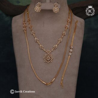 his Diamond Look Combo Set (JCCM497) is a modern, floral-themed jewelry collection designed to replicate the brilliance and sparkle of fine diamonds. It provides a high-end, sophisticated aesthetic suitable for formal occasions at an accessible price.
