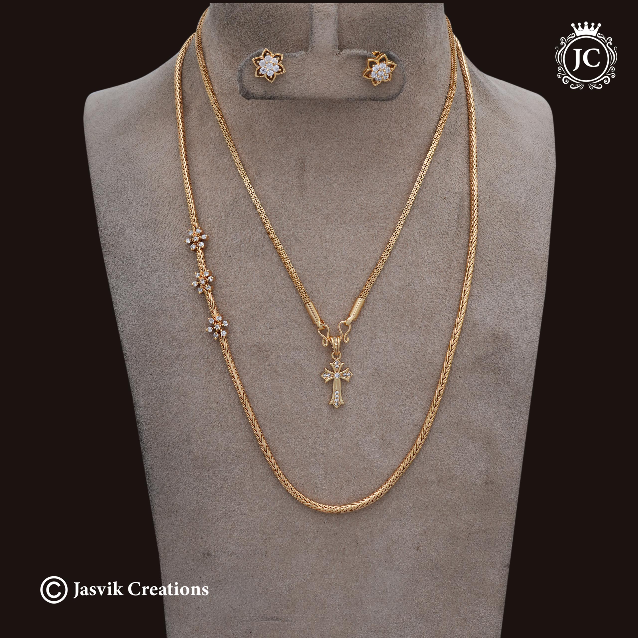 Long Muggappu Chain: A long, box-style gold chain featuring a side-set “Muggappu” (ornamental side piece) made of four connected crystal flowers.